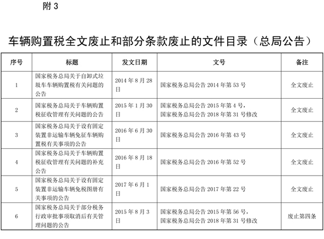 為落實《中華人民共和國車輛購置稅法》(以下簡稱《車購稅法》),規范車輛購置稅征收管理,現就有關事項公告如下: 一、車輛購置稅實行一車一申報制度。 二、《車購稅法》第六條第四項所稱的購置應稅車輛時相關憑證,是指原車輛所有人購置或者以其他方式取得應稅車輛時載明價格的憑證。無法提供相關憑證的,參照同類應稅車輛市場平均交易價格確定其計稅價格。無同類應稅車輛市場平均交易價格的,由稅務機關依據《中華人民共和國稅收征收管理法》(以下簡稱《稅收征管法》)及其實施細則核定其應納稅額。 原車輛所有人為車輛生產或者銷售企業,未開具機動車銷售統一發票的,按照車輛生產或者銷售同類應稅車輛的銷售價格確定應稅車輛的計稅價格。無同類應稅車輛銷售價格以及同類應稅車輛無銷售價格的,按照組成計稅價格確定應稅車輛的計稅價格。 三、購置應稅車輛的納稅人,應當到下列地點申報納稅: (一)需要辦理車輛登記的,向車輛登記地的主管稅務機關申報納稅; (二)不需要辦理車輛登記的,單位納稅人向其機構所在地主管稅務機關申報納稅,個人納稅人向其戶籍所在地或者經常居住地的主管稅務機關申報納稅。 四、《車購稅法》第十二條所稱納稅義務發生時間,按照下列情形確定: (一)購買自用應稅車輛的為購買之日,即車輛相關價格憑證的開具日期; (二)進口自用應稅車輛的為進口之日,即《海關進口增值稅專用繳款書》或者其他有效憑證的開具日期; (三)自產、受贈、獲獎或者以其他方式取得并自用應稅車輛的為取得之日,即合同、法律文書或者其他有效憑證的生效或者開具日期。 五、納稅人辦理納稅申報時應當如實填報《車輛購置稅納稅申報表》(附件一,以下簡稱《納稅申報表》),同時提供車輛合格證明和車輛相關價格憑證。 六、納稅人在辦理車輛購置稅免稅、減稅時,除按本公告第五條規定提供資料外,還應當根據不同的免減稅項目,分別提供以下資料的原件或者復印件: (一)外國駐華使館、領事館和國際組織駐華機構及其有關人員自用車輛,提供機構證明和外交部門出具的身份證明。 (二)城市公交企業購置的公共汽電車輛,提供所在地縣級以上(含縣級)交通運輸主管部門出具的公共汽電車輛認定表。 (三)懸掛應急救援專用號牌的國家綜合性消防救援車輛,提供中華人民共和國應急管理部批準的相關文件。 (四)回國服務的在外留學人員購買的自用國產小汽車,提供海關核發的《中華人民共和國海關回國人員購買國產汽車準購單》。 (五)長期來華定居專家進口自用小汽車,提供國家外國專家局或者其授權單位核發的專家證或者A類和B類《外國人工作許可證》。 七、免稅、減稅車輛因轉讓、改變用途等原因不再屬于免稅、減稅范圍的,納稅人在辦理納稅申報時,應當如實填報《納稅申報表》。發生二手車交易行為的,提供二手車銷售統一發票;屬于其他情形的,按照相關規定提供申報材料。 八、已經繳納車輛購置稅的,納稅人向原征收機關申請退稅時,應當如實填報《車輛購置稅退稅申請表》(附件二,以下簡稱《退稅申請表》),除提供納稅人身份證明外,還應當按照下列情況分別提供以下資料: (一)車輛退回生產企業或者銷售企業的,提供生產企業或者銷售企業開具的退車證明和退車發票。 (二)其他依據法律法規規定應當退稅的,根據具體情形提供相關資料。 九、納稅人應如實申報應稅車輛的計稅價格。 納稅人沒有編造虛假計稅依據的,稅務機關按照其申報的計稅價格征收稅款;納稅人編造虛假計稅依據的,稅務機關依照《稅收征管法》及其實施細則的相關規定處理。 十、稅務機關追繳稅款時,納稅人無法按照規定提供申報資料的,可以依據司法、審計、財政等有關機關的文書,為其辦理補稅手續。 十一、本公告要求納稅人提供的資料,稅務機關能夠通過政府信息共享等手段獲取相關資料信息的,納稅人不再提交。 十二、本公告所稱的納稅人身份證明:單位納稅人為《統一社會信用代碼證書》或者營業執照或者其他有效機構證明,個人納稅人為居民身份證或者居民戶口簿或者入境的身份證件。 本公告所稱車輛合格證明為整車出廠合格證或者車輛電子信息單。 本公告所稱車輛相關價格憑證,境內購置車輛為機動車銷售統一發票或者其他有效憑證,進口自用車輛為《海關進口關稅專用繳款書》或者海關進出口貨物征免稅證明。屬于應征消費稅車輛的還包括《海關進口消費稅專用繳款書》。 十三、稅務機關應當在稅款足額入庫或者辦理免稅手續后,將應稅車輛完稅或者免稅電子信息,及時傳送給公安機關交通管理部門。 上款所指稅款足額入庫的情形包括:納稅人到銀行辦理車輛購置稅稅款繳納(轉賬或者現金)由銀行將稅款繳入國庫的,國庫已傳回《稅收繳款書(銀行經收專用)》聯次;納稅人通過橫向聯網電子繳稅系統等電子方式繳納稅款的,稅款劃繳已成功;納稅人在辦稅服務廳以現金方式繳納稅款的,主管稅務機關已收取稅款。 十四、納稅人名稱、車輛廠牌型號、發動機號、車輛識別號、證件號碼等應稅車輛完稅或者免稅電子信息與原申報資料不一致的,納稅人可以到稅務機關辦理完稅或者免稅電子信息更正,但是不包括以下情形: (一)車輛識別代號(車架號)和發動機號同時與原申報資料不一致。 (二)完稅或者免