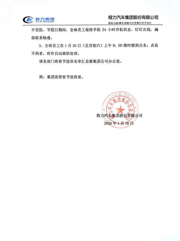 2020年喜迎新春佳節,湖北程力集團專用汽車有限公司春節工作安排: 請持票人員在1月19日(星期日)下午1:30準時到鳳凰酒店參加2020年度年會,要求參會人員統一著藍色工作服入場,服從會場指揮人員的安排,遵守會場紀律,會議期間請保持良好紀律并不得中途退場,體現程力精神,會議最后舉行抽獎活動。 |