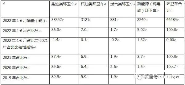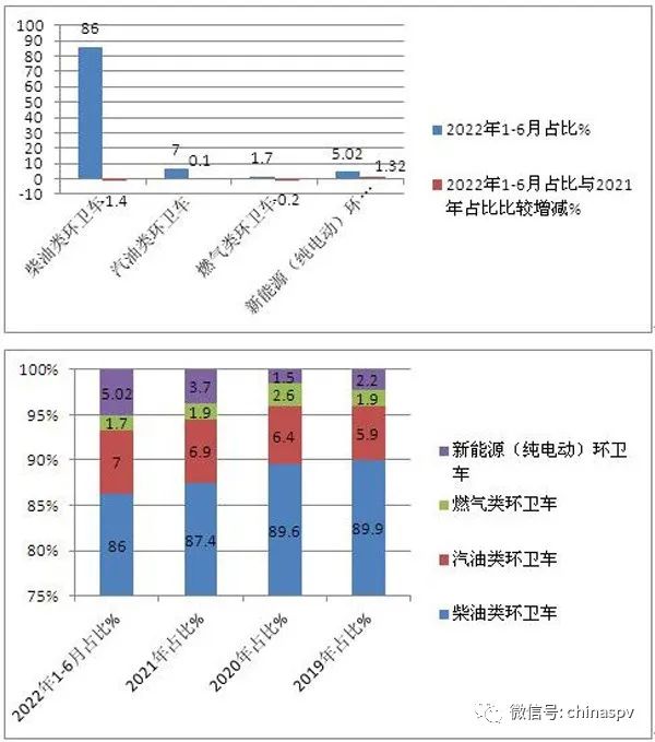 上圖表可見,按動力中了劃分,在今年上半年的環衛車銷量結構中: