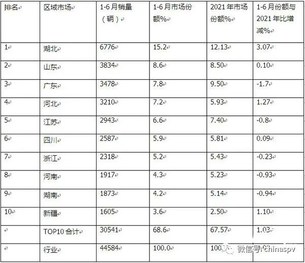 ---湖北銷量6776輛,占比15.2%,居第一,且與2021年比占比增加3.07個百分點,強者更強,表現突出;