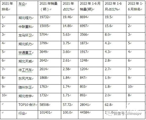 表6,根據終端上牌信息(不含出口),2022年1-6月及2021年環衛車主流車企TOP10銷量排名統計: