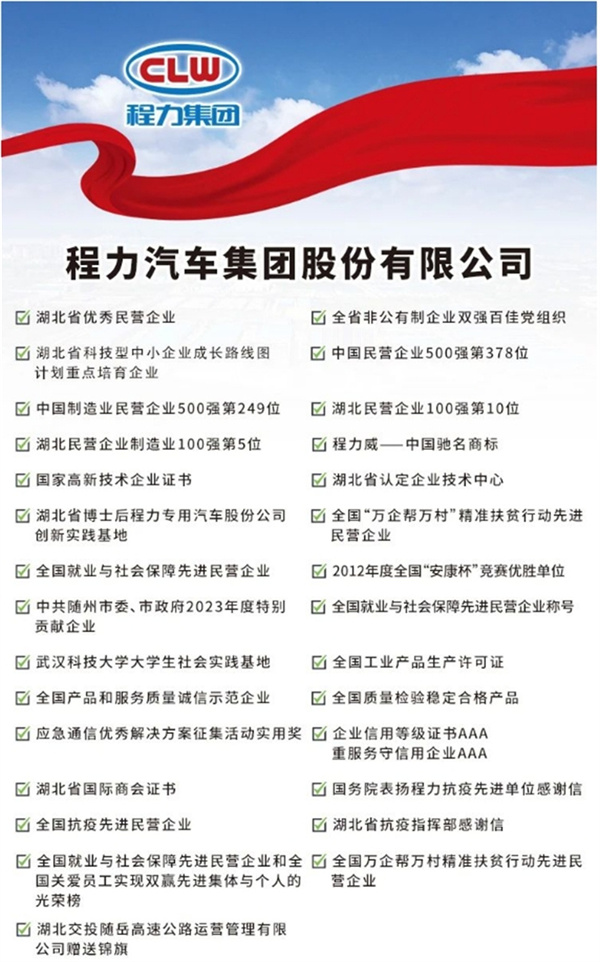 歡迎來到湖北程力汽車官方網站,程力專用汽車股份有限公司專業生產環衛垃圾車,掃路車,平板運輸車,混凝土攪拌車,隨車吊,清障車,冷藏車,廣告宣傳車等300多種產品。程力專用汽車股份有限公司歡迎廣大新老客戶來廠參觀和訂車。