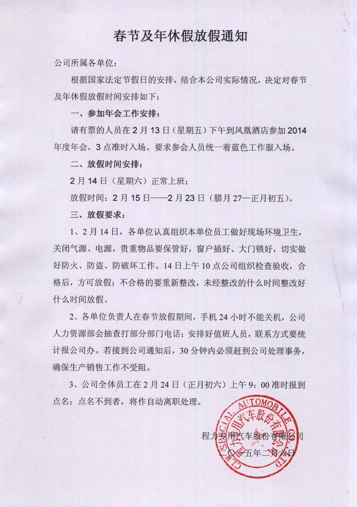 2015年湖北程力春節放假通知