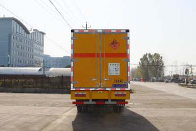 運輸品名:炸藥,雷管,煙花爆竹等,類項號:1.1B,1.1D,1.1G,1.2G,1.3G,1.4G 等。廂體頂部封閉不可開啟,側(cè)、后防護裝置材料材質(zhì)為Q235A碳鋼,側(cè)防護與箱體底部焊接連接,后防護裝置與車架采用焊接連接,后防護截面尺寸(mm):100×50,離地高度為450mm。該車隨底盤選裝駕駛室,選裝側(cè)面開門。僅選用發(fā)動機型號: ISB3.9-125E40A、YC4E140-42對應(yīng)的油耗值分別為(L/100km): 18.83、19.39。安裝前輪盤式制動器,安裝子午線輪胎和帶ABS的底盤。安裝帶有衛(wèi)星定位功能的行駛記錄儀。ABS系統(tǒng)生產(chǎn)廠家/型號:東風(fēng)電子科技股份有限公司汽車制動系統(tǒng)公司/36BG13-30010。 |