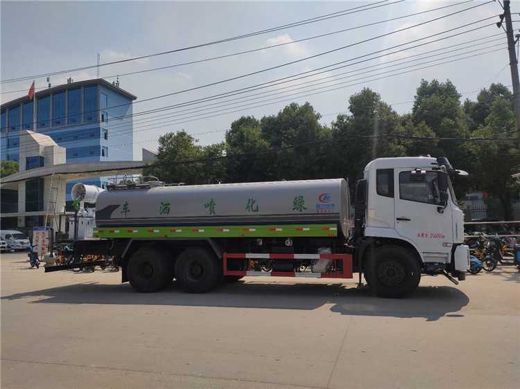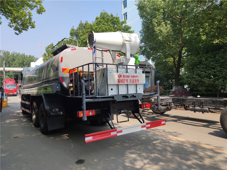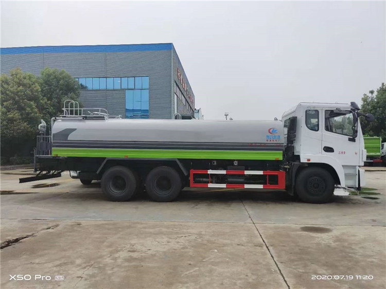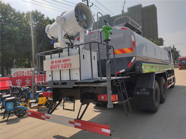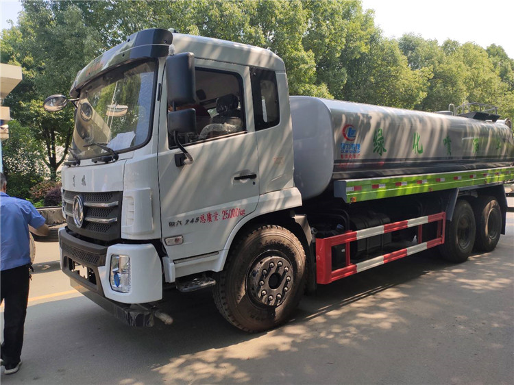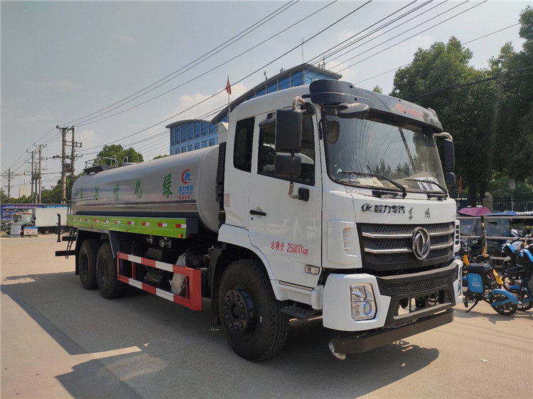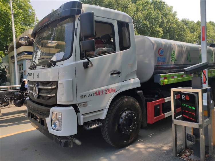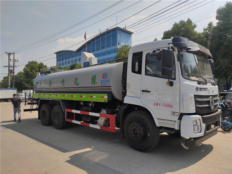 湖北程力國六東風(fēng)錦程V6后雙橋18噸灑水車程力威牌CLW5253GPSD6型綠化噴灑車廠家配置: | 湖北程力國六東風(fēng)錦程V6后雙橋18噸灑水車底盤配置:采用東風(fēng)后雙橋原裝底盤,東風(fēng)錦程齊星軍工V6四點懸浮駕駛室,4350+1350mm軸距,搭載國六(國Ⅵ)東風(fēng)康明斯230/260馬力柴油發(fā)動機,功率169/191kw,國六排放,陜齒法士特八檔變速箱,11.00R20鋼絲胎,前橋5T,后橋雙10T,方向助力,斷氣剎,排氣制動,原裝空調(diào),行駛記錄儀,多媒體顯示屏,電動門窗,中控鎖,氣囊座椅,ABS。湖北程力國六東風(fēng)錦程V6后雙橋18噸灑水車專用配置:罐體容積:19立方米,罐體鋼板為4mm碳鋼Q235材質(zhì)專用容積板一次成型,罐內(nèi)隔板具有防波作用,以減輕汽車行駛時罐體液體沖擊;配大功率專用灑水泵,泵可自吸自排;整車前沖、后灑、側(cè)噴、后平臺帶綠化灑水炮,灑水炮可全方位旋轉(zhuǎn),可連續(xù)調(diào)成直沖狀、大雨、小雨、毛毛雨;前封頭帶水位計,后平臺主管路帶1寸澆花接口,后爬梯,帶1個消防接頭,帶1個自流閥,1個過濾裝置。湖北程力國六東風(fēng)錦程V6后雙橋18噸灑水車選裝配置:1、可選裝氣動球閥開關(guān)駕駛室內(nèi)控制; 2、可選裝后平臺帶CLW-30、40型霧炮機組